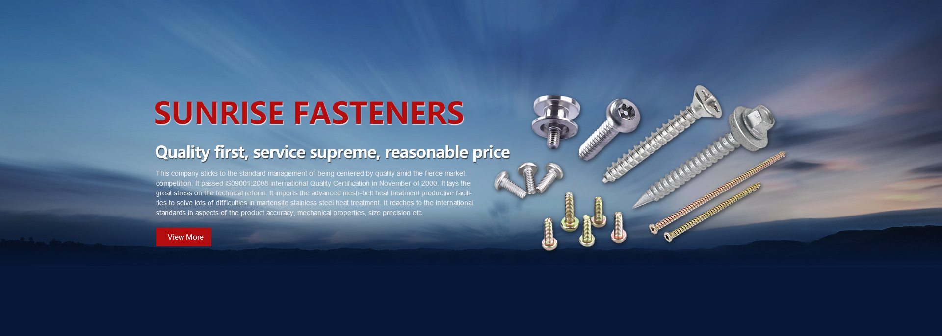 Founded in 1984, Ningbo Sunrise Fasteners Co., Ltd. is a sole proprietorship with great strength. Company produces various screws, non-Standard products etc. according to GB, JIS, ANSI, DIN, ISO Standards and so on. It can reach europe ROHS Requiremeut. Sun Rise fasteners has abundant technical force, the advanced productive equipments, complete testing facilities. It introduces a full set of the precision and high speed screw manufacture device. "Fangrui" brand which has been individually possessed by our company enjoys high reputation among the same trade.